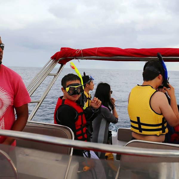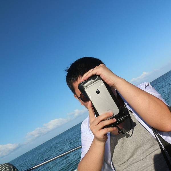 sky说在毛里求斯,追海豚这个项目已经有好几十年的历史了,所以这里的海豚是祖祖辈辈都习惯了早上这个时间点有人去看它们,跟它们一起玩耍,所以不用害怕这些野生的海豚会来伤人,它们是很友好的。sky自称海豚小王子,说每次他来都能看到很多海豚的~而且他很认真的说,看海豚就要来大海,这里才是它们的家,这里才是它们能畅游的地方,动物园的海豚被关在那么小的空间里,失去了自由的权利,它们也会得抑郁症,在动物园里的海豚寿命就很短,只有6,7年,而这些野生的海豚可以活几十年。毛里求斯的海水环境真的很好,记得那时在斯里兰卡,同行的小伙伴去美瑞沙追海豚,愣是把人都开吐了,还没看到影子,但这里,你看,还能看到岸边,海豚就已经出现了,所以在毛球追海豚不用担心晕船哦sky让我们想下去的人需要救生衣的都穿上救生衣,然后救生衣就不够了。。。。哈哈哈