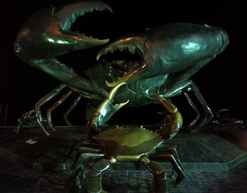晚上去了一家餐厅,刚好正对面就是这几只横行无比的巨螃蟹铜像了,灯光不够亮,人也无几个