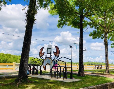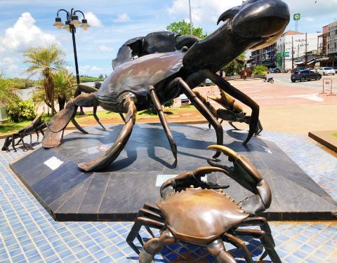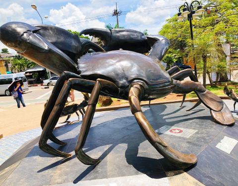 景点是在镇上。,河边。就是几只大螃蟹没有其他了, 所以顺路经过的话无妨。顺便打打卡。特意坐车去的话,个人觉得就无必要了。附近有一个夜市下午四点钟后才开。距离大螃蟹雕像不到五分钟。但这个夜市主要卖水果及熟食。然后河的对面有几间吃海鲜的。另外收获。可以浏览河上景色。第九张图片~就是发现对面马路有双条车,可以去big C. 第十张相~而对面马路其中一间餐厅.200 泰币海鲜任食。可以火锅可以烤。