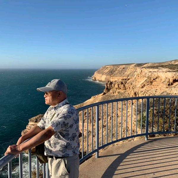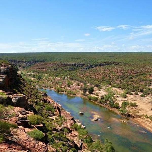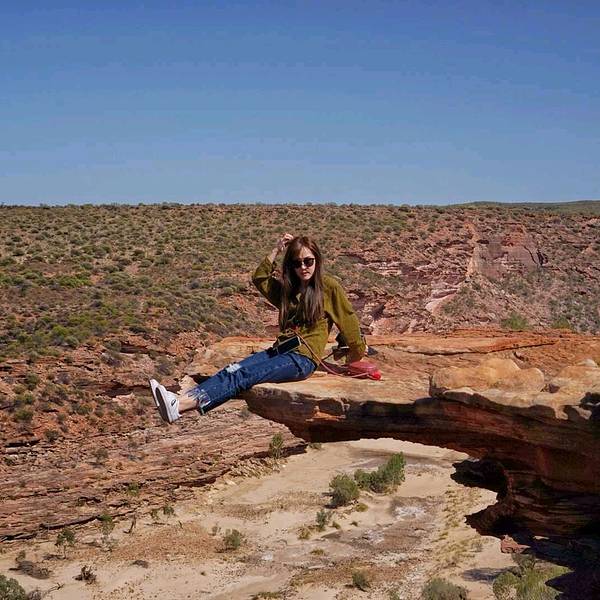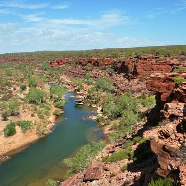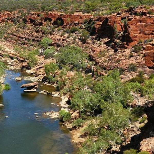 静静的河水在缓慢地流动,两岸的灌木在水中隐隐约约地露出了一个个倒影:这就是默奇森河——Murchison River,它是西澳大利亚排名第二长的河流,源头海拔521 米,纵深 820 公里 , 流域面积达到82,000 平方公里,入海口在印度洋。内陆延伸的部分,三弯九曲,蜿蜒流长。 峡谷的对岸是一片一片的石林,可以捕捉到不少奇异的镜头。 俯身望去,水底下布满了青苔:不远处,有一只俯身在水中的巨兽在寻觅着什么; 有一堆嶙峋突兀的岩石——稍远的空中,有一个尖嘴样的东西伸出了岩体,半悬在空中,澳洲人把它叫作Hawks head ,译成中文是鹰头石