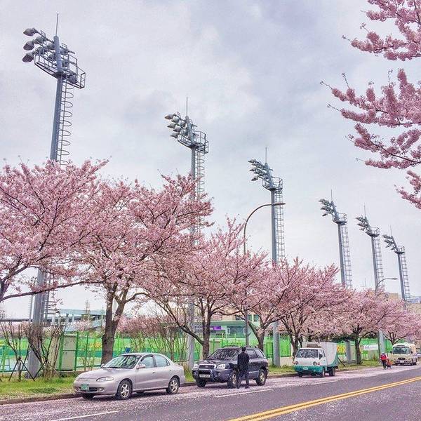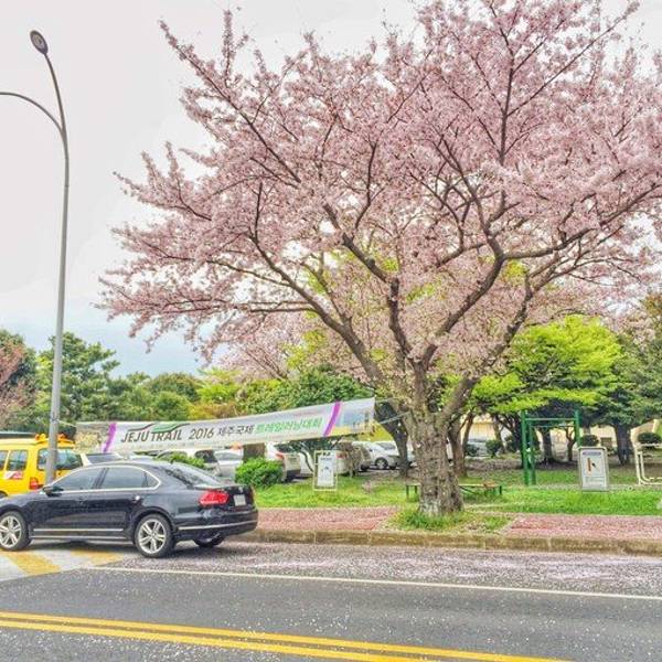 综合竞技场(제주종합경기장) 交通:离典农路很近,步行15分钟左右。 也可以坐公交车到济州市外巴士总站,下车走路5分钟左右。 特色:有油菜花和樱花相衬。 综合竞技场也是樱花节举行的一个场地, 当时是在网上看到一张有樱花和油菜花相配的照片,觉得很美, 但我们来的时候油菜花已经过花期了,找了好久都没找到。 不过这边的路旁全是樱花, 我们走着的时候一阵风吹落花瓣,真的被樱花雨美哭了。