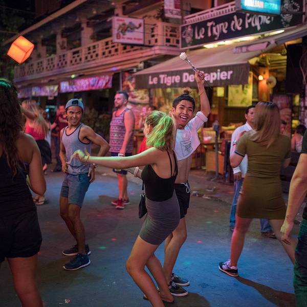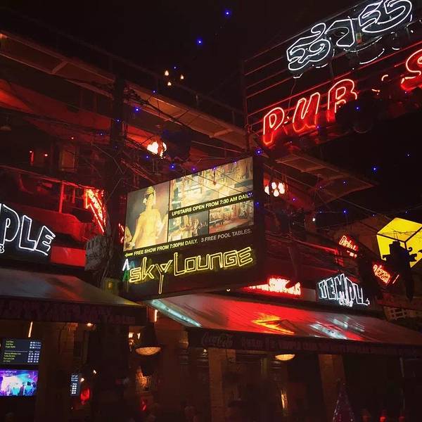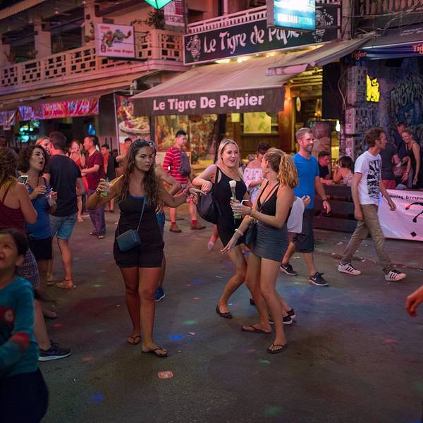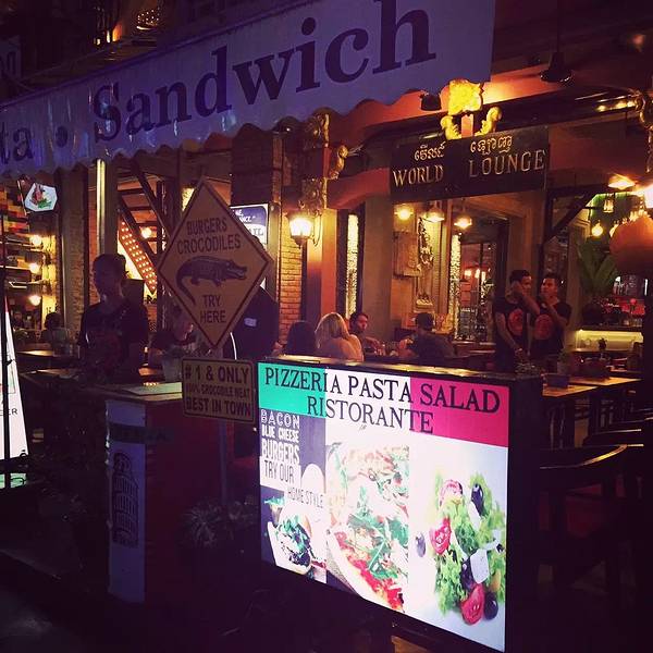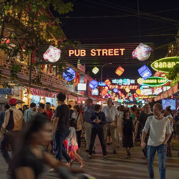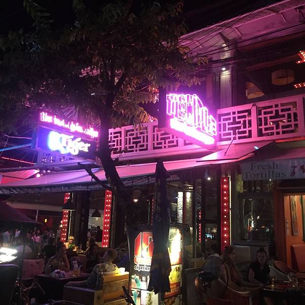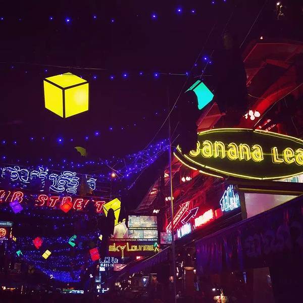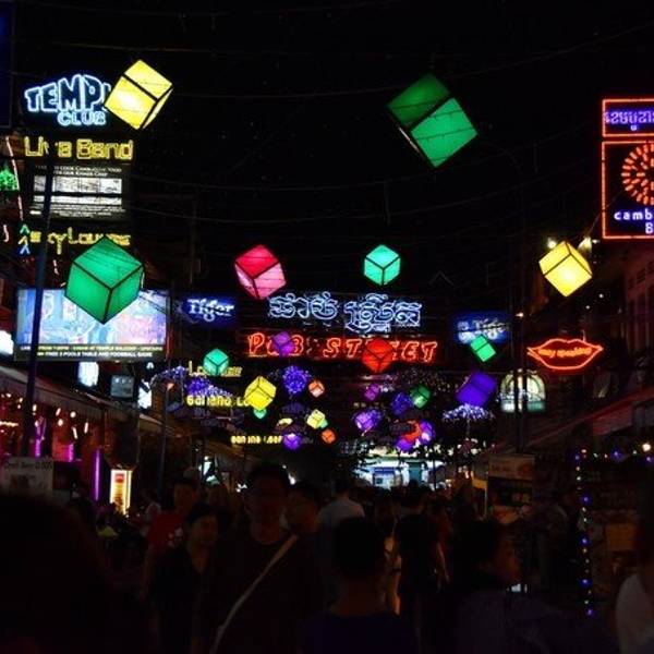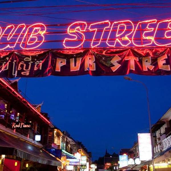 在人潮鼎沸的暹粒老城区,老市场的旁边有一条让外国人流连忘返的酒吧街“Pub street”。酒吧街,顾名思义,这条街上有不少酒吧,只不过与传统意义上的酒吧不同,它们还兼有餐馆的功能,白天,游客们在街上的餐馆吃饭,晚上,游客们来酒吧喝一杯,与新认识的朋友们聊天。 酒吧街热闹非凡,除了有酒吧,还有一些店铺,不少出售英文书籍和明信片的书店,不少出售手工艺品的店铺。走着逛着,你就能看到那些著名的酒吧:红钢琴、Temple Club等。