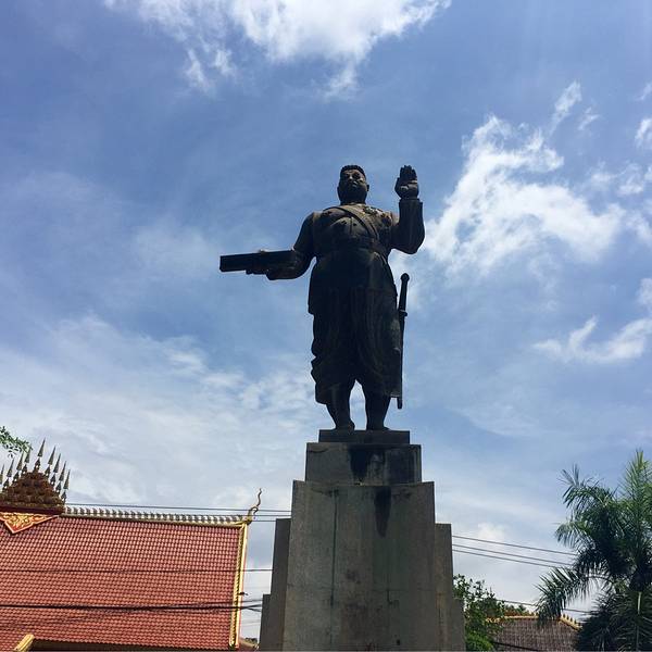西里萨旺翁国王雕像位于湄公河畔,手持与暹粒签订的两国免战文书,身配宝剑,正对着暹粒国家,貌似在...西里萨旺翁国王雕像位于湄公河畔,手持与暹粒签订的两国免战文书,身配宝剑,正对着暹粒国家,貌似在说休想侵略我国!!!