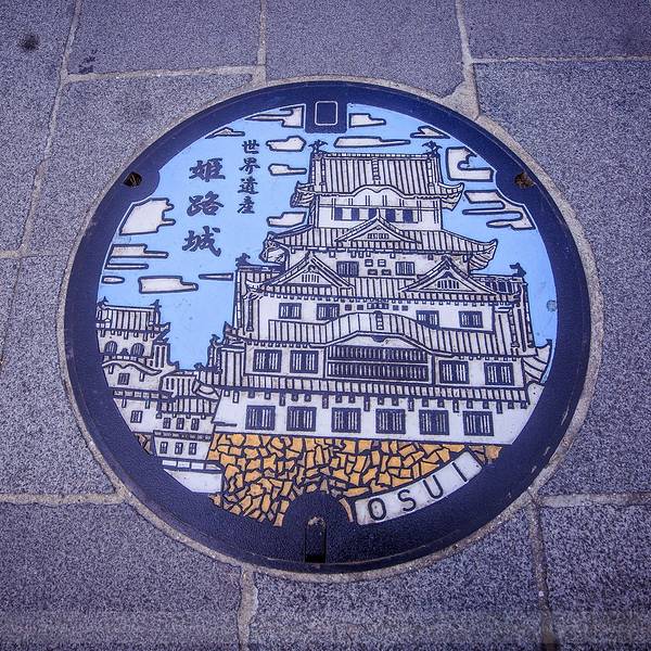 姬路市姬路的游客服务中心就在JR站的出口旁,从这里可以搭乘姬路城观光环城公交当看着这个窨井盖时,代表你正式进入了姬路城景区