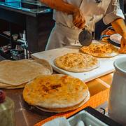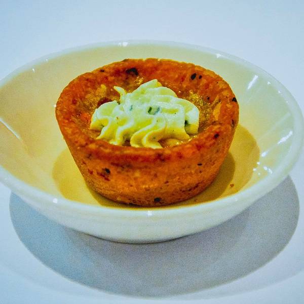 特制马铃薯烤饼配以乳状黄油,20 月龄帕马森干酪,DOP 品质发泡起司,番茄汁