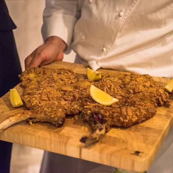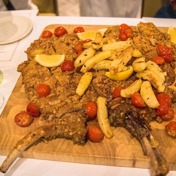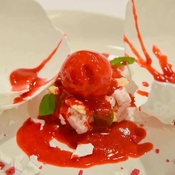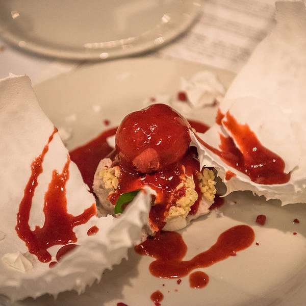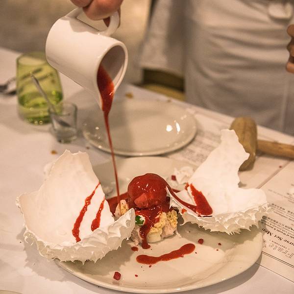 Fratelli福特利餐厅是由蜚声国际的名厨兄弟Enrico和Roberto Cerea共同执掌,两兄弟来自意大利传奇料理世家,打造来自意大利的纯正料理米其林三星餐厅,呈现意大利式的生活美学。一进门处便是开放式的厨房,来自各...Fratelli福特利餐厅是由蜚声国际的名厨兄弟Enrico和Roberto Cerea共同执掌,两兄弟来自意大利传奇料理世家,打造来自意大利的纯正料理米其林三星餐厅,呈现意大利式的生活美学。一进门处便是开放式的厨房,来自各国的厨师正在烹制美味的佳肴。整个餐厅是清新淡雅的色调给人很舒服优雅的感觉,这是为我们骆驼家族提前预留好的座位。刚入座就有外国帅哥为我们斟酒,这服务体验太棒了。第一道菜就是餐厅的主打菜之一——Oro Nero披萨。厨师特意叫我们去厨房看他们制作的过程,有幸用相机记录下了这一过程。以墨鱼番茄酱为基底,撒上斯卡莫札干酪,佐以特殊腌制的鳕鱼、白蛤蜊、西西里贻贝和鲑鱼籽。在木火烤箱中烤制完美脆香之前,再撒上金粉。烤制完成的披萨味道不仅一级棒,最后点睛的金粉显得特别的高大上,薄脆的口感加上海鲜的仙味儿一连吃了两大块好像都没有满足,但想到后面还有更多的美味就暂且给肚子留些空间吧。前菜是波士顿龙虾搭配牛油果酱,这道前菜也是相当惊艳,小伙伴们纷纷对它赞不绝口,其中一位妹子更是吃完后还在吧唧嘴,不停地回味着味道边说鲜嫩的龙虾搭配爽口的牛油果酱简直不能更棒了。第二道前菜是炸红虾搭配烤番茄,加上蜂蜜芥末酱,香脆的口感加上番茄的酸甜非常爽口,越来越期待接下来的主菜快点上来。今天的主菜是手切方形意大利面配炖牛肋骨肉与黑松露,特色是由一种特殊的“吉他”状意大利面制作工具制作而来,呈现出方块形状和特殊质地。这可以说是我目前为止吃到过最最惊艳的意面了,一口吃下去满满的幸福感油然而生,整个味道非常浓郁,牛肋骨肉也非常香嫩,搭配些许的黑松露,锦上添花让浓郁的口感更加深刻。吃到这时大家都纷纷表示吃饱了,就在等待甜品的时候就看到厨师端着满满一大块牛排向我们走来,形状酷似两片象耳朵。大厨表示这道菜还未完成,还需要添加一些作料。在切好的牛排上撒上烤至好的马铃薯和小番茄才算完成。和刚说完很饱的小伙伴们又二话不说的大快朵颐的分掉了这一大块“米兰小牛排”。厨师特意选用在国际食坛名气较高的意大利特产“Fassone”小牛排,这里为大家普及一个小知识,“Fassone“牛群生长于意大利西北部,以极其鲜嫩柔软的肉质及脂肪含量较低著称。而为了追求最极致的风味和口感,Cerea兄弟在牛肉的嫩化处理前会在肋骨上选择一个特定的切口,嫩化完成后粘滚上面包屑在澄清的黄油中煎炸。配上柠檬番茄口感不会太油腻,这道福利特餐厅最特别的季节性菜品也体现了Cerea兄弟对于不断完善经典意大利菜肴孜孜不倦的追求。在饭后正式的甜品上来前先上了一道很特殊的小甜品,是Mojito为原料制作的鸡尾酒冰沙,在吃完那么多荤菜后尝到这么清爽的甜品简直是太美好了,原来酒还可以这么做,下次自己在家也要试一试。这时厨师又端来Cerea家族精心制作的招牌意大利面包Panettone。最不容错过的甜品——Rossella的草莓星球是由Cerea兄弟的姐姐Rossella打造的全新甜品。这是一道充满戏剧张力的甜品,在上桌时是一个白色的星球,厨师用小木锤将外层的蛋白脆饼敲碎,一个草莓冰淇淋从星球里闪现出来,特别惊喜,最后在冰淇淋球上淋上草莓酱,味道香甜浓郁。福利特餐厅不愧是米其林三星餐厅,从食材选择到烹制再到口感简直不能更棒了,强烈推荐这家,最后和主厨来一张合影还收获一张主厨签名照,颇有感慨又收获满满的一餐。