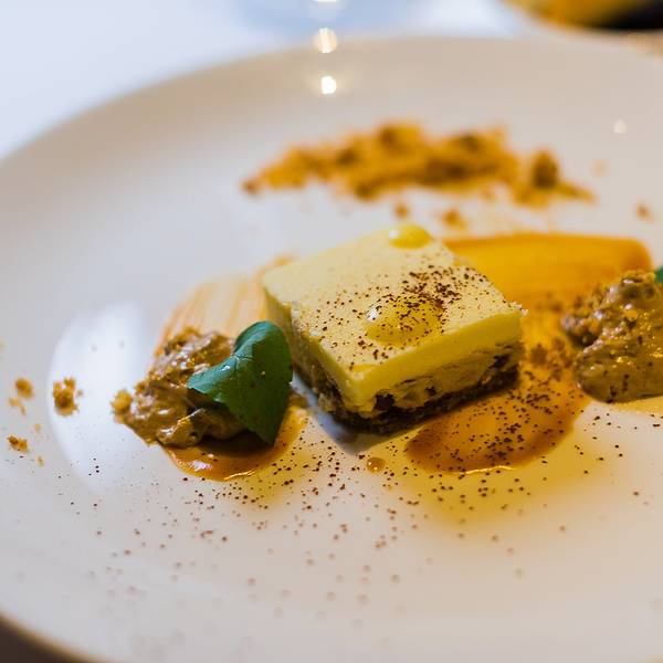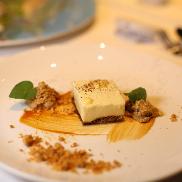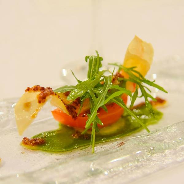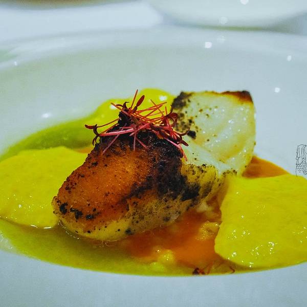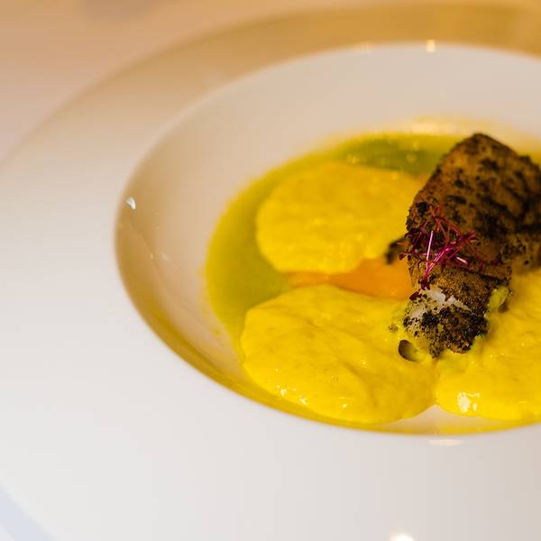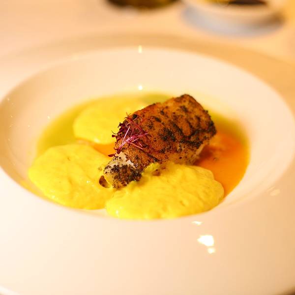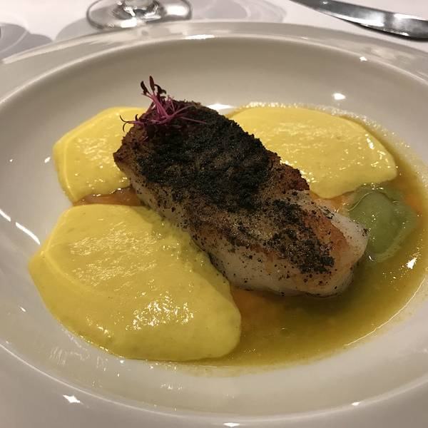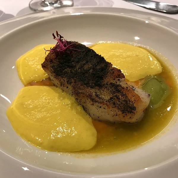 Merluzzo In Giallo 招牌鳕鱼排配以黄番茄酱汁,藏红花马铃薯慕斯&芳香格兰尼塔冰品
