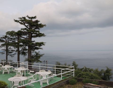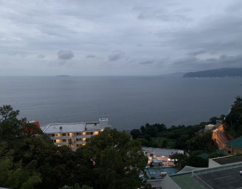 美轮美奂的视觉就是一个类似于大板天守阁的建筑,很像我们的阁楼在热海城上,东面是宽阔的大海,一望无际的尽头就是天空,天色暗下来的时候,无法分辨哪里是海平面。美轮美奂的视觉!