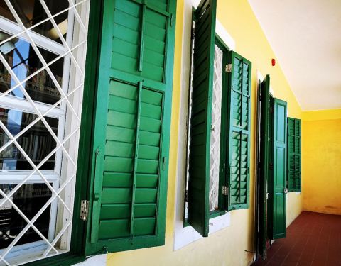 在海风的徐徐吹拂下,闲逛着的我们既感不到夏日的炎热,也没有任何赶路打卡的焦躁。临窗有一个老爷爷在看书从圣方济各教堂出来,沿着马路继续往前走一小段路,一个柠檬黄的图书馆跳入了眼帘。这次是柠檬黄与墨绿色的撞色。