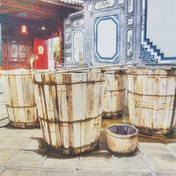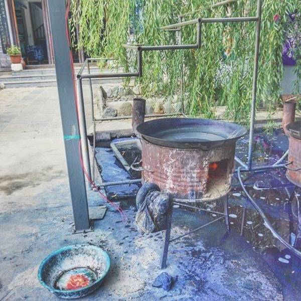 特色染缸还有白族的照壁。里面的场地非常的大,自己手工做的桌子就有十几张。阿志忍不住来体验了一下