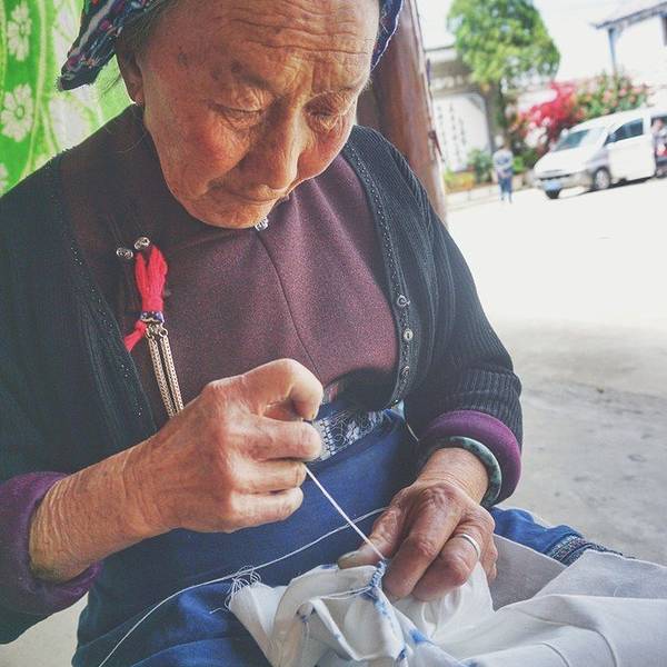 第二天清晨在古城里面,我去了向往已久的扎染房,扎染是我给人非常想了解的云南文化之一。扎染古称扎缬、绞缬、夹缬和染缬,是中国民间传统而独特的染色工艺。织物在染色时部分结扎起来使之不能着色的一种染色方法,中国传统的手工染色技术之一。 扎染工艺分为扎结和染色两部分。它是通过纱、线、绳等工具,对织物进行扎、缝、缚、缀、夹等多种形式组合后进行染色。其工艺特点是用线在被印染的织物打绞成结后,再进行印染,然后把打绞成结的线拆除的一种印染技术。它有一百多种变化技法,各有特色。如其中的“卷上绞”,晕色丰富,变化自然,趣味无穷。更使人惊奇的是扎结每种花,即使有成千上万朵,染出后却不会有相同的出现。这种独特的艺术效果,是机械印染工艺难以达到的。想象一下在古代洱海边,这么浪漫的地方孕育出了扎染这个传统手艺,大理民族扎染采用民间图案,通过对传统的扎染工艺进一步渲染和艺术加工,使之成为艺术化、抽象化和实用化融为一体的工艺品。其工艺由手工针缝扎,用植物染料反复染制而成,产品不仅色彩鲜艳、永不褪色,而且对皮肤有消炎保健作用,克服了现代化学染料有害人体健康的副作用。跟着几个老工艺的奶奶,学习扎染,亲手制作了一个染布。