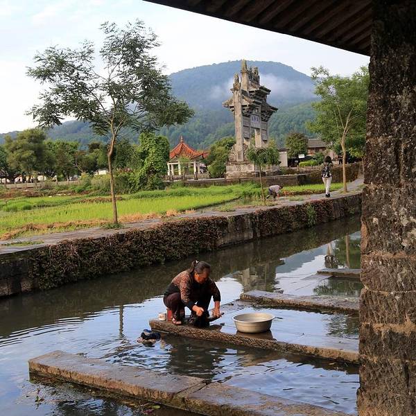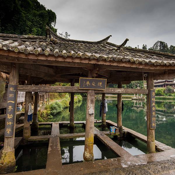 和顺洗衣亭位于保山市腾冲县和顺古筝内,临近龙潭湖,和顺的男人出国到缅甸东南亚“走夷方”的传统,年复一年,日复一日,他们思念家乡,思念亲人,为了家里守望的女人们洗衣有个遮风避雨的地方,便修建了洗衣亭,可以说洗衣亭是和顺最独特最温柔的公益建筑。洗衣亭若就是男人宽宽厚厚的胸膛,年关近了,离乡背井的男人总要回来,女人总是在村口的洗衣亭守望亲人。洗衣亭的建筑是明清时代的风格,亭上有飞檐式的青瓦顶,宽大的亭盖被几根巨大的楸木梁柱撑着,亭下铺着一道道光滑的石板、石沟、石栏。
