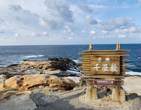 千叠敷是由新第三纪层的砂岩所形成的岩盘。由于砂岩是由砂子凝固而成的岩石,因此质地非常软,受到海浪经年累月的侵蚀之后,终于形成今日复杂而且独特的景观。 千叠敷的“叠”在日文念成“榻榻米”,“敷”是铺的意思。所以千叠敷的意思,就是把1千张的榻榻米平铺在地上。岩盘有大约4公顷之大,足够放1千张的榻榻米之大,因而得名。千叠敷、三段壁和圆月岛,同是白滨町知名的观光景点。 恰巧千叠敷所在的海岸属于西岸,所以这里自然就成为观赏日落的佳选,站在平坦的岩盘上观赏着火红的太阳缓缓沉入广阔的太平洋,自古以来即为此地的名胜。