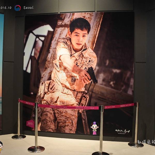 因为都塔免税店是宋仲基代言的,所以专门有一层主题是太阳的后裔,好几个电视里的场景和宋仲基的人形...