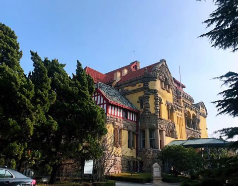 青岛德国总督楼旧址博物馆又叫迎宾馆,这是一座德国古堡式建筑,其内部为宫廷式木质结构,如今依然可见到的内部陈设。总督楼位于信号山公园南麓,目前为青岛高级别的接待宾馆。博物馆的建筑造型与色彩很特别:黄色的墙面上不规则地镶嵌着花岗岩石料作装饰,红色为主的屋顶中又安插了蓝色和绿色的屋顶,屋檐上伸出一只德国古代战舰上的装饰品——诺曼底龙头,站在楼前仿佛来到了童话世界。博物馆的外部色彩丰富,特别适合拍照,但其内部禁止拍照。在这栋建筑内,你可以感受到德式设计的严谨,比如所有木头家具的木板接缝间连刮脸刀片都插不进去,一个世纪过去了,都没有出现过质量问题,楼内的暖气到现在依然可以使用。而地上铺的厚软地毯,陈设着的水晶灯、水晶镜子、象牙钢琴,都可让你感受到欧洲宫廷般的氛围。 楼内共有四层,底层是半地下房间,原为总督仆从的用房,现在开了家咖啡室,四层是办公区不对外开放,所以真正供游客参观的只有二层和三层。因为从大门进去就身处二层,所以习惯上又把二层称为一楼,把三层称为二楼。二层主要是总督招待宾客的地方。餐厅里摆放着水晶镜子;大厅顶部悬挂华丽的水晶灯,一侧墙角的壁炉上嵌着绿色玉石;宴会厅里有架珍贵的象牙钢琴,吊灯上镶嵌满宝石;二层还有路通向个很大的花房,所有陈设可谓富丽堂皇!三层主要是总督的卧室和办公处。上楼看到的第一个房间是桥牌室;往前有育婴室,里面所有的物品都没有棱角,吊灯的灯光很柔和,不会伤害孩子的眼睛;总督夫妇卧室内也摆放着水晶镜子,值得注意的是一台枪橱,只有钥匙孔却没有把手,需要两只手用力转旁边的两块木头机关才能打开橱门,可以防止孩子误开——即使有了钥匙也因力气小拧不开机关。这些设计都细致巧妙而贴心。景点背后便是信号山公园,可一并游览。登上山顶,能俯看迎宾馆和青岛市,眺望海景,视野开阔。