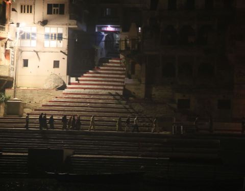 伴着极大的雾霾,坐在船上欣赏恒河景色,欣赏河坛。清晨五点半,恒河边的瓦拉纳西已经苏醒了清晨五点半,恒河边的瓦拉纳西已经苏醒了。 伴着极大的雾霾,坐在船上欣赏恒河景色,欣赏河坛。 说实话,清晨灯光下的河坛,美的像一副油画行走其中的人都显得神圣无比。