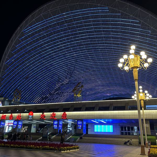 然后出了站就是很有特色的烟台站,往东面走几步就是大悦城了,可以吃吃逛逛,楼顶还有能看见海的撸狗...第一海水浴场钟表博物馆海边十字街十字街灯光秀灯光秀看海,吃海鲜