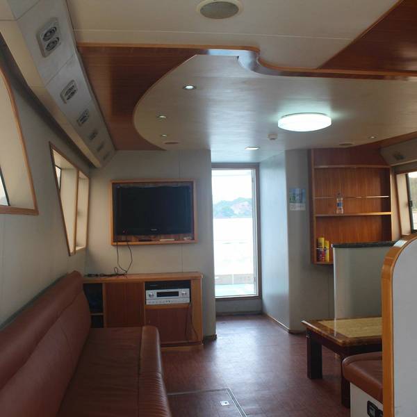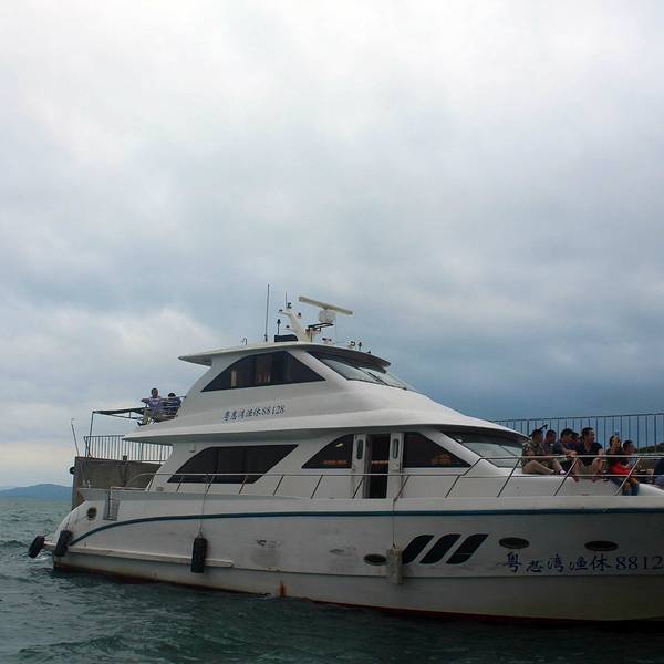 早早起来天气有点灰蒙蒙,不是很晴朗,但是海风吹过来很舒适,统一在酒店门口集合,统一乘坐大巴前往游艇出发,因为人数较多总共是两艘豪华游艇,分开不同的人前往不同的游艇,安排好就开始出发,鸡冻了,第一次...
