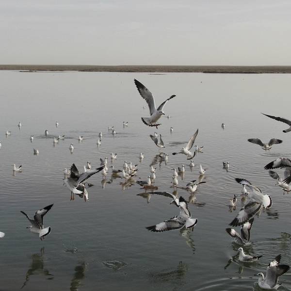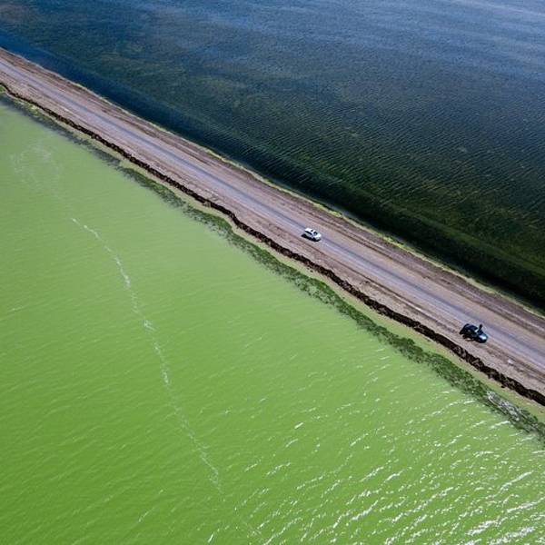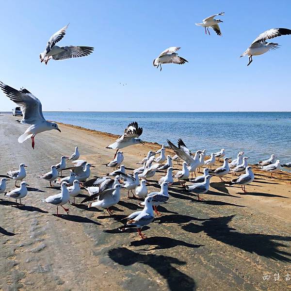 1、哇,这确实是美景,公路分开了湖水,两侧的湖水因地质和阳光折射呈现出不同的颜色,一侧偏蓝且广袤,类似大海;一侧偏绿同时折射出黄和宝石蓝三种颜色,有大量的水鸟起落,看来水质不错