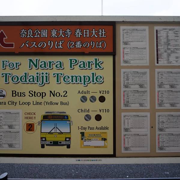 JR奈良站有很多条观光巴士路线,我们的目的地是奈良公园,于是做了2号线到“大佛殿春日大社前”下车一下子便到了奈良站。出来之后有个旅游的Information,可以拿免费的地图,我们还咨询了下如何坐公车去奈良公园。