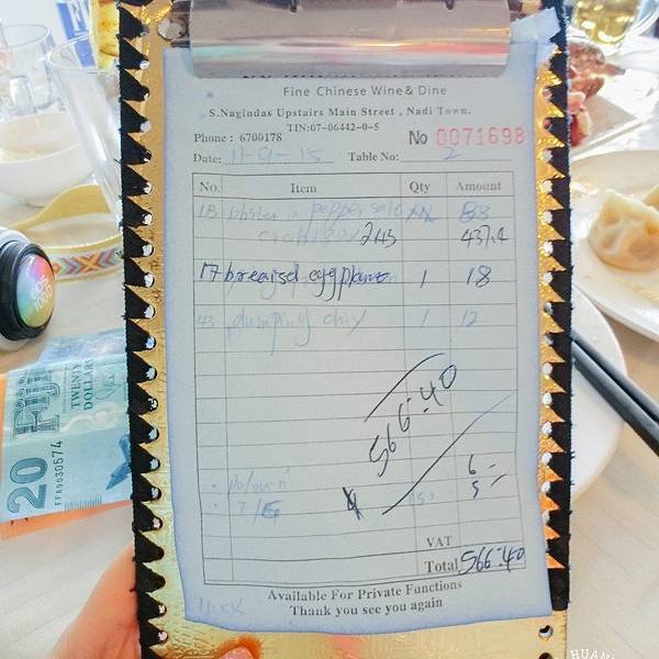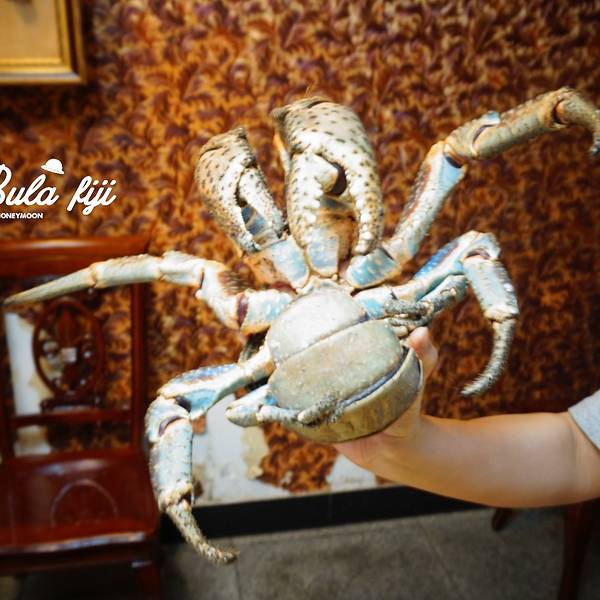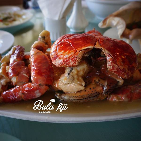 在斐济的第一顿选在了北方人开的渤海海鲜酒家这里上去二楼 菜单有中文,有一个服务员是中国人时令水果果汁小份龙虾 椒盐红烧茄子服务员推荐的椰子蟹,说是吃椰子长大的螃蟹。180FJD一公斤,一只就很大,所以我们把龙虾改了小份,但是最后还是没吃完,真!的!很!大!蟹黄很鲜,也没吃完~蟹脚超级大椰子蟹的蟹肉真的很厚!!就这样一顿饭,三个菜,一瓶啤酒一杯果汁,还有一盘水饺。566.40FJD,大概1700元人民币,是我们吃的最贵的一餐。真的蛮好吃的,但也是贵呀~~~