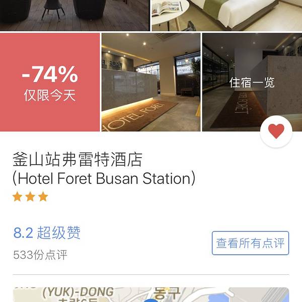 定位写在了夜市,而实际上是酒店在这附近。 从釜山站出来右手边小马路直走十分钟,就到了截图的酒店。三人一间,一张大床一张特大床,睡着特别舒服。 但就是,屋子里太热了。四月末的天气,开空调也不舒服,不开...