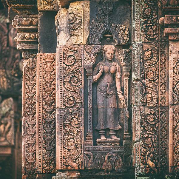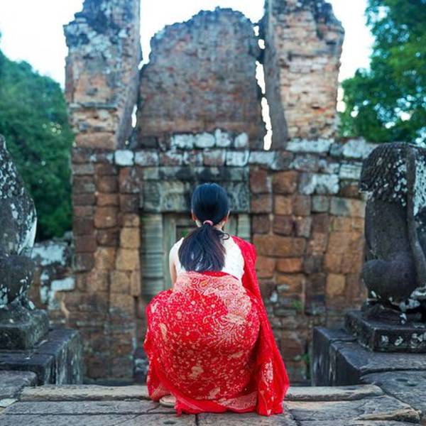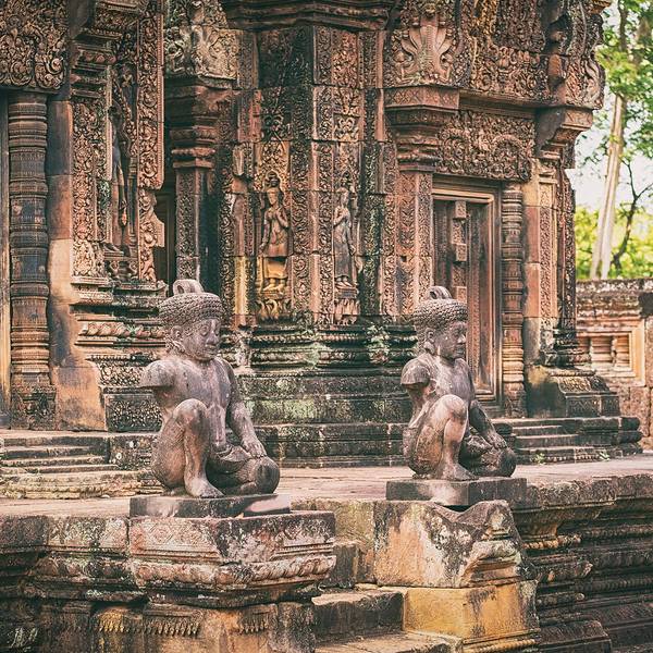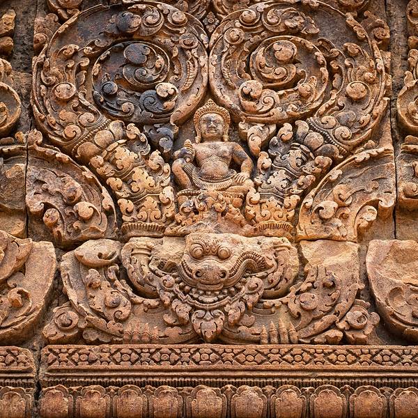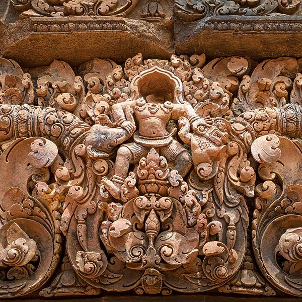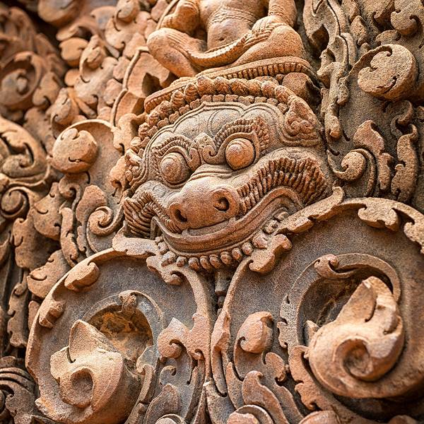 《摩诃婆罗多》与《罗摩衍那》的经典故事在墙壁上雕刻的生动逼真,精致的浮雕甚至将人物的服饰、鸟兽...在远离通王城三十公里之外,在苍翠的林野之间,色彩艳丽的女王宫(Banteay Srei)宛若一颗从皇冠上遗落的珍珠,显得格外惹眼。女王宫中没有女王,这是一座供奉湿婆的庙宇。与吴哥寺和通王城相比,它的建筑规模可...在远离通王城三十公里之外,在苍翠的林野之间,色彩艳丽的女王宫(Banteay Srei)宛若一颗从皇冠上遗落的珍珠,显得格外惹眼。女王宫中没有女王,这是一座供奉湿婆的庙宇。与吴哥寺和通王城相比,它的建筑规模可谓迷你,然而在这座以红色砂岩建造的庙宇墙壁上,却布满了繁复细密、玲珑精巧的浮雕,被誉为“岩石上的刺绣”。《摩诃婆罗多》与《罗摩衍那》的经典故事在墙壁上雕刻的生动逼真,精致的浮雕甚至将人物的服饰、鸟兽的爪牙、浪花造型的背景以不可思议的细致程度展现的淋漓尽致。中央祠塔的四面蹲守四种形态的守卫,分别是天神阿修罗、 狮子 神辛玛、神鸟伽鲁达和猴神哈努曼。