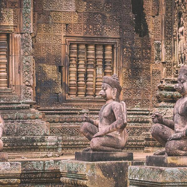 后期复建的猴神哈努曼虽然形态依旧,但雕刻的细节却与原迹的伽鲁达相去甚远。没有一块砖石不被浮雕装饰、没有一处细节不被精雕细琢,这座远比吴哥寺早两个世纪建成的小巧庙宇,却以最为精美的浮雕和鲜艳的色彩在吴哥众多遗迹中绽放出独特的魅力。 展开
