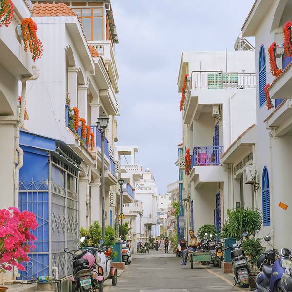 越是惊艳,让人越是喜欢,越是离不开眼睛,美景总是藏在最深处,彻底颠覆了我在10分钟前对他的印象...这里被称为中国版的圣托里尼,位于于三亚市天涯区马岭社区,也被称为天涯小镇,每次提起天涯这两个字,就莫名的觉得很遥远,而天涯小镇就位于距离天涯海角不远处的一座小镇上,这座小镇面朝大海,水清沙白,民风...这里被称为中国版的圣托里尼,位于于三亚市天涯区马岭社区,也被称为天涯小镇,每次提起天涯这两个字,就莫名的觉得很遥远,而天涯小镇就位于距离天涯海角不远处的一座小镇上,这座小镇面朝大海,水清沙白,民风淳朴。其实一开始对这座小镇并没有报太多的幻想,因为直到到达小镇的入口,都没有觉得很惊艳,很亮眼的地方,说是小镇,更贴切的说,是几条街道组成,一条名为黑龙街,一条名为黄龙街,这两条街在入口可以看到,任意一条街道都可进入,除此之外还有青龙街,白龙街和红龙街,但这三条街道,在此次行程中还没有找到。看着没有任何特点的街道,真是应了一句话“来都来来,那就去看看吧”,这一看不要紧,却发现了一个宝藏之地,深深的把我带入了这里蓝色世界,这个地方真的是越往里面走,越是惊艳,让人越是喜欢,越是离不开眼睛,美景总是藏在最深处,彻底颠覆了我在10分钟前对他的印象,十分前我可能只是觉得他只是几条单调无趣,且把房子刷成蓝白色的巷子街道,并无其他亮点,直到当我走到尽头,才发现并不是如此,原来他把他最美的地方,藏在了这条巷子的最深处。蓝白相间的浪漫房子,深邃的巷子,悠闲的人们,来来往往的车辆,把这里装饰的分外妖娆,巷子的尽头便是海边,这个画面又像极了日本动画片《灌篮高手》中的景点画面——鎌仓高校前车站是江之岛电铁,午后,巷子里的老人孩子们在这里悠闲惬意的吹着海风,炎热的夏季,在这里居然出奇的凉快,坐在台阶上,凉爽的海风从海的尽头吹向这里,在这里未曾感到一丝丝的炎热。巷子尽头的海边是渔夫们停靠渔船的地方,也正是这些渔船,成为了这道海岸线上最独特,最原始的风景,如果不赶时间,可以在这里欣赏一场日落也是不错的选择,虽说没有椰梦长廊的光怪陆离,却也不失霞光的云蒸霞蔚。华灯初上的小镇,像是被天空浸染上了颜色,整片海面,整片街道都被染成了蓝色,一片安静祥和的景象出现在眼前,由于没有被完全开发,所以这里基本上没有任何的商业化信息,如果你也喜欢这样的景色,不妨在他在商业化之前来体验下这里的风土人情与美丽风景。 展开