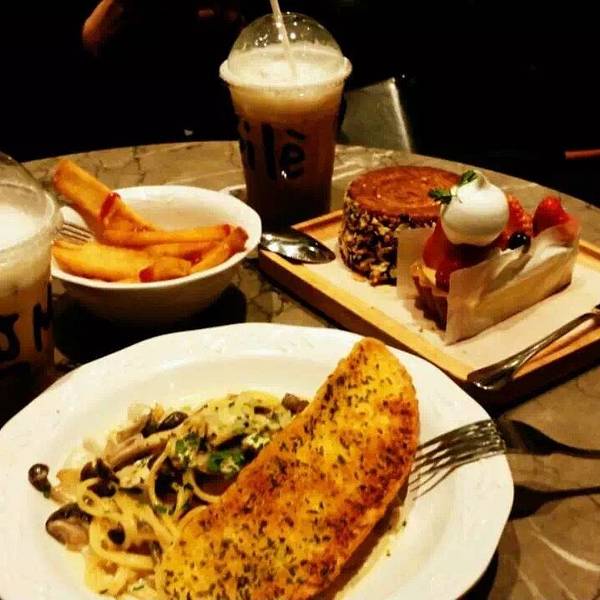 这家星美乐没有香港的大,但是出品也是杠杠的。这间店在太古汇空中花园里面,进入太古汇之后直上顶层,推开玻璃门就能看到了。每一次到这里,必点的就是薯条,这里的薯条微辣,和麦当劳的相比,个头特别大,外脆内软,真的超级好吃。还有就是这里面蛋糕,虽然蛋糕的分量不如以前,但是味道没有变。蛋糕和面包的买相都非常吸引人,上面铺着的水果的都非常新,水嫩水嫩的。草莓蛋糕是小清新的味道,酸酸的草莓配上微甜甚至有点咸的cream, 非常搭的。这里一杯饮料大约20多RMB,偏贵的,味道没什么特别。意粉可以尝尝,分量挺多,酱汁味道特别。他们家的出品可以在展示柜看到真身哦,外貌协会的我们肯定是向颜值高的糕点下手啦。这家店有室内和室外的座位,但是室外挺多人吸烟的,虽说挺大风的,但味道还是有点大。室内也因为人多,感觉有点闷。无论是室内还是室外,现在的座位都分布得密密麻麻的,舒适度比以前下降了。这家店所在的商场非常多奢侈品的商店,到附近的商场逛街也不用到室外晒,直接穿地铁过去就可以了。
