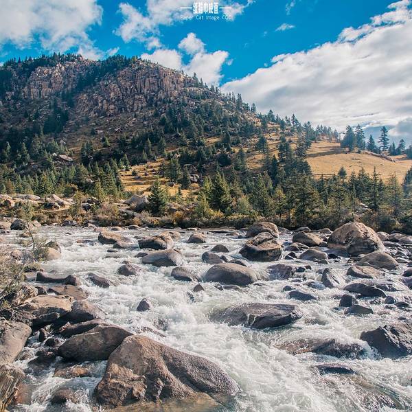 稻城出发不久就会路过一个叫石子河的地方,潺潺流过的小河顺流而下,与远处的原野和山脉相互呼应。