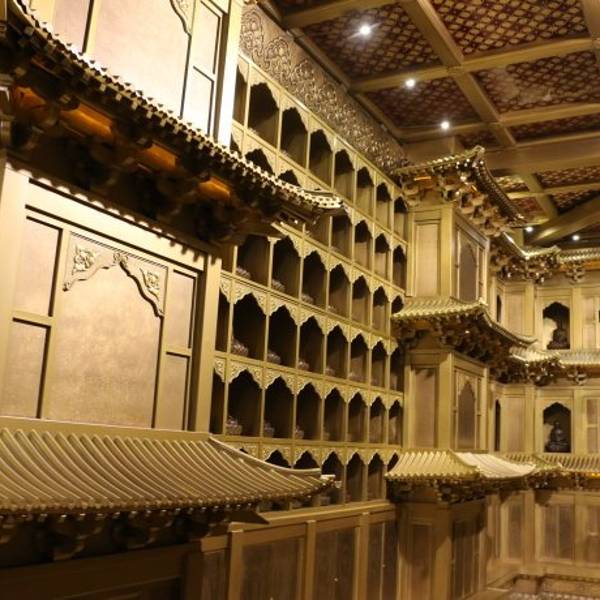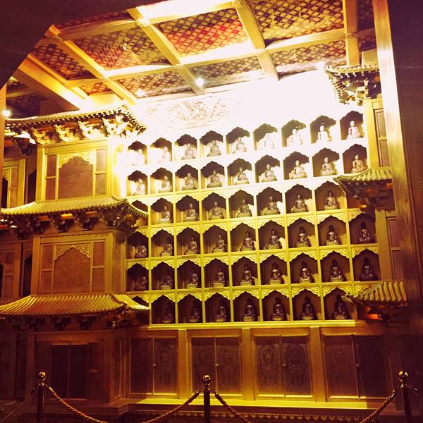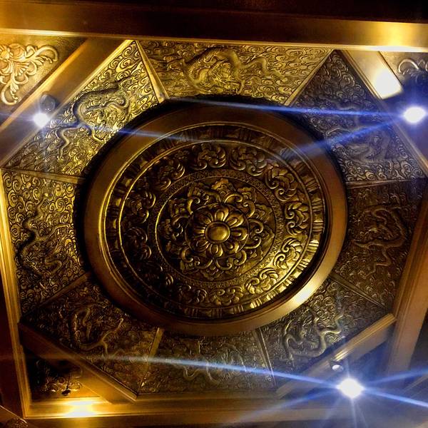华严宝塔是继应县木塔之后全国第二大纯木榫卯结构的方型木塔,塔身明三暗两共五层,通高43.5米,上景金盘,下承莲池,是大同古城内的标志性建筑。塔下有很大的铜殿,称千佛地宫。资料介绍有500平方米,采用100吨纯铜打造而成。虽为当代所建仿古建筑,但仍显庄重典雅。珍贵的是,地宫内供佛祖舍利,并铜雕千佛像、铜塔,铜线刻佛教人物或飞天等,工艺水准不低。说它是传统与现实完美结合的典范之作,并无夸张。当代仿古建筑,能够达到这样一个高度,实属罕见。