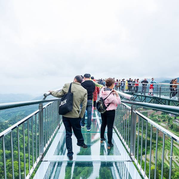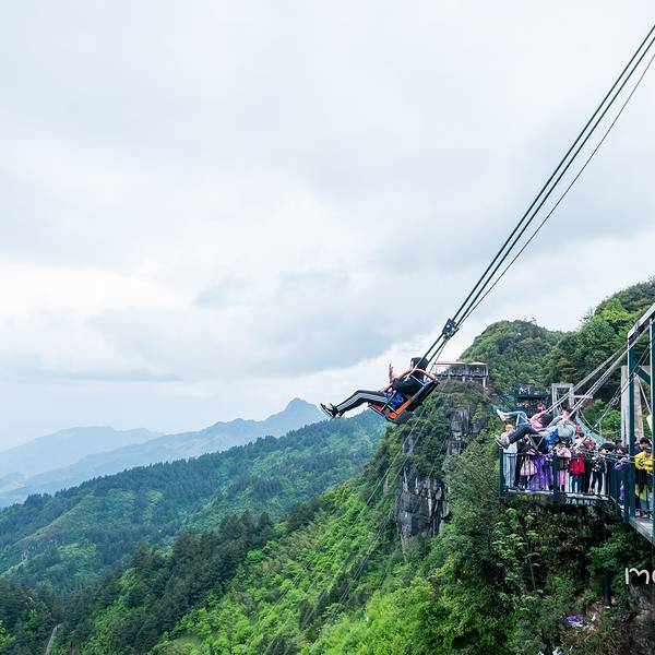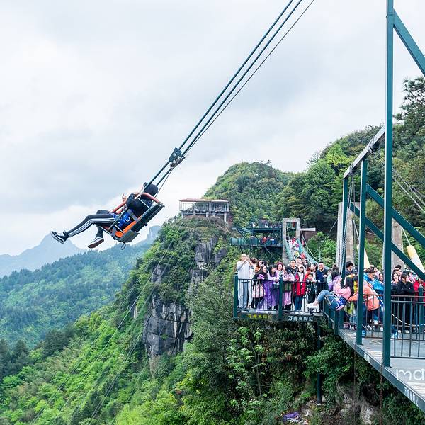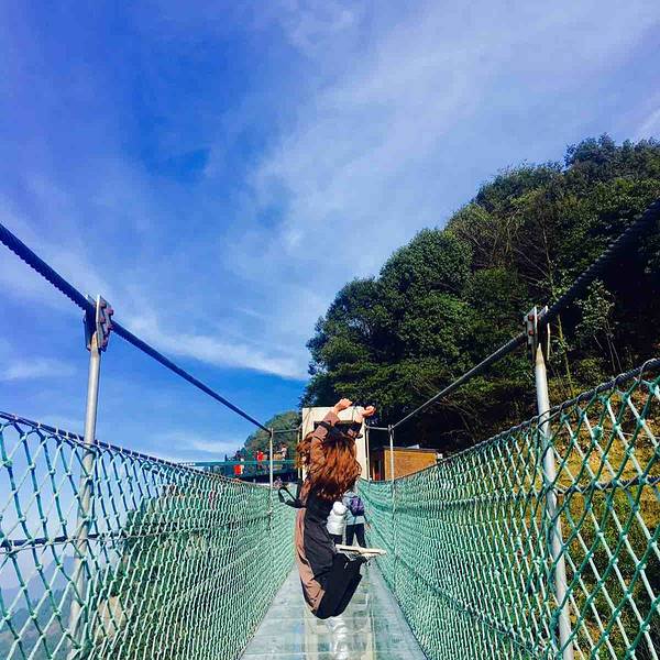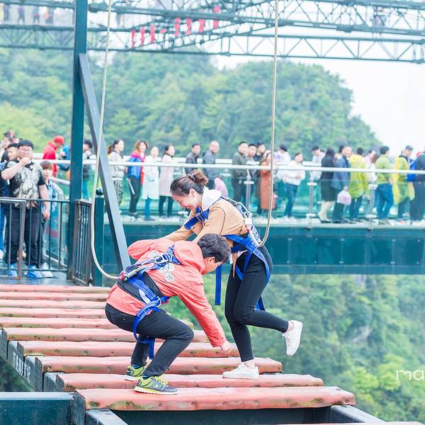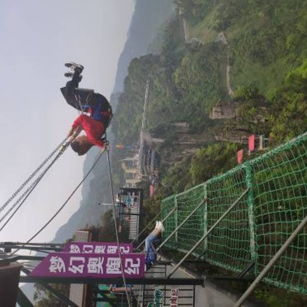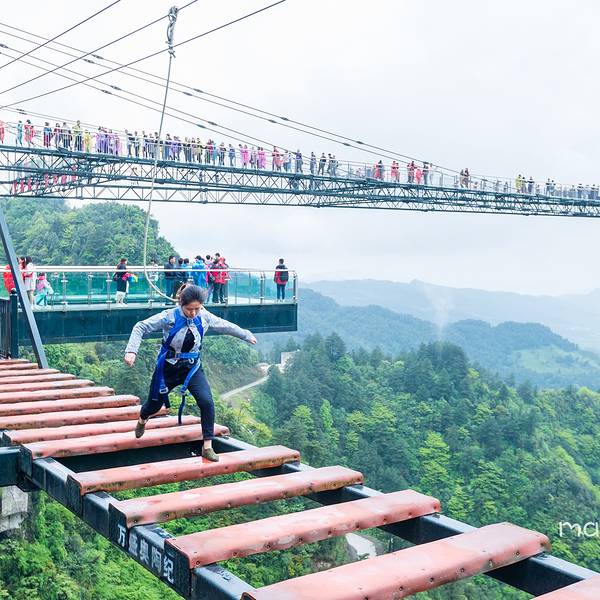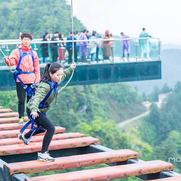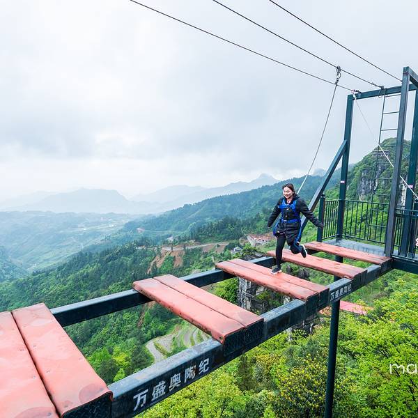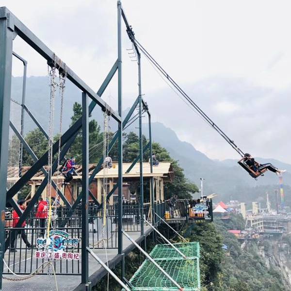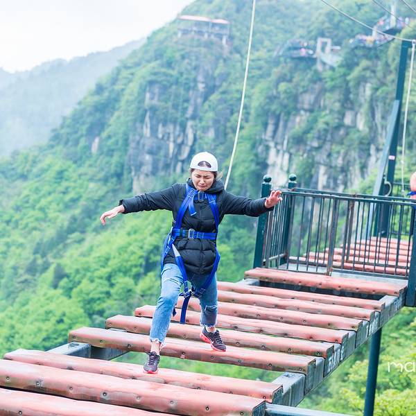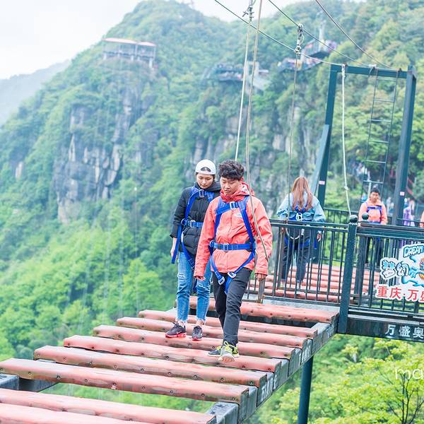 每到周末节假日,你是不是都在考虑应该去哪里玩?即使明明知道这个时候出门会堵人堵车再加上堵心,但仍然会硬着头皮要挤进去,为了什么,还不是因为平时工作太忙、压力太大,终于放假的时候,就想着能出去走走,得到有效的释放和喧嚣,所以现在游乐、竞技、挑战类的地方越来越受到大家的喜爱,这里不仅可以挑战自我,证明自己,也把心中积压已久的不良情绪彻底发泄出来,顿时轻松许多。 位于重庆万盛区黑山之巅的梦幻奥陶纪公园,就是非常好的选择,距重庆主城区约110公里,从重庆主城驱车前往不到2个小时,这里不仅有可供各个年龄段游玩的游乐设施,更有惊险刺激的10大高空项目——天空悬廊、云端廊桥、极限飞跃、高空漫步、步步惊心、悬崖秋千、高空荡桥、玻璃吊桥、高空速滑、丛林飞跃。我已经迫不及待了,就跟着我一个一个去体验吧。 天空悬廊“世界第一天空悬廊”是梦幻奥陶纪最大的特色,它建在近300米的悬崖峭壁之上,桥身全长近200米,悬廊沿悬崖向外挑70米,成“A”字形,桥面铺设全透明玻璃,有一种直插云霄的即视感。是不是只是看着就觉得有点晕了,反正我是。目前国内的高空项目有很多,也去过一些,但当我看到奥陶纪的天空悬廊时,真的有点吓到了。想想自己马上就要去挑战吉尼斯世界纪录的“最长的悬挑空中玻璃走廊”,心中真是即紧张又激动。慢慢随着人流拾阶而上,看着前后左右的人们,虽然互不相识,但感觉大家一起走上这座悬廊,心里顿时觉得踏实了一些。当天天气不太好,上午还一直在下雨,虽然现在雨已渐渐变小,但玻璃廊道上仍然有一点点滑,所以大家走的更加格外小心。大家都一手扶着栏杆,慢慢的向前挪动,我也跟随着大家缓缓向前,我有点恐高,所以一直提醒自己不能往下看,但好奇心又驱动着我偷偷向下瞄了几眼,我的妈呀,吓死宝宝了,突然对“万丈深渊”有了深刻的理解,立马感觉眩晕起来,感觉停住脚步,闭上眼睛缓一缓,想退回去,发现已经走出来一大半,看到旁边的人都在坚持向前,想想还是要继续前进,深吸一口气后,眼神直视前方,挪动着前行。越靠近悬廊尽头,越是会感觉到“人在走,廊在抖”,轻微的晃动都会引起更严重的回应,想想自己已经离崖边有70米的距离,离地面已有300多米,偶买噶,突然发现,世界上最远的距离不是生与死,也不是没有网络,而是我在桥头,你在桥巅,我们相差近70米的距离。虽然一路走的战战兢兢,但当我到达悬廊尽头时,还是感觉自己取得了小小的胜利,似乎也慢慢适应了走在空中的感觉,再往回走时,少了一些恐惧,多了一份惬意,人生不就是在不停的挑战中度过吗?恐惧,更多的时候是来自内心,战胜自己,就已经成功了一半。当你俯看下面的人群时,有没有一点小小的激动和自豪? 极限飞跃 上一张照片里,有没有看到缩小版悬廊旁边堆了很多人,那里就是奥陶纪里另一个人气很高的挑战项目——极限飞跃。悬廊虽然可怕,但毕竟有栏杆可以扶,脚下也有虽然完全透明,但心里还是知道它很坚固的玻璃,而这里,除了腰上那根绳子,真的只能靠自己了。300米的高空,在间距0.8米-2.5米不等的平台之间高空跳远,这玩的绝对是心跳呀,0.8米的距离很容易,就像正常走路一样就过去了,但是你再看看最后一个2.5米的,这么远的距离一定要用力跨出,腿稍微短点都有点悬呀,我光是看着都觉得胆战心惊。最后一个2.5米的间隔后,就是一个栏杆,所以当你奋力跨过时,对面是栏杆可以帮你稳定和缓冲的,很多朋友鼓起勇气,拼命跨过去后,仍心有余悸时,一转身准备返回,这时就傻眼了。因为返回的第一个间隔就是刚才好不容易跨过那个,但是回去可是没有栏杆的咯,万一没跨过,或者冲力太大,停不住脚步,前倾或者左摇右晃,分分钟都有可能被悬在空中,看看这位小姐姐的表情,就知道了。极限飞跃分成了两部分,一边是间隔有大有小的,而另一边则都是间隔比较大的,更适合男生,男生女生这时大多自动分成两边开始排队,但也有个别单子大的女生去挑战,好吧,我在心里给你点个赞,真是厉害。是不是被我说的有点不敢尝试了,不要怕,当你真的遇到困难时,会有小哥哥来解救你的,但是小哥哥也有调皮的一面,看到你已经安全,没有危险时,就会来“调戏”你咯,来解你的鞋带,或者站在上面用力的跳,这位小哥哥,你到底懂不懂怜香惜玉?小姐姐们,能站上去已经很不容易了,就不要再吓唬她们了。请记住这位淘气的小哥哥,下次他在的时候要小心一点点,哈哈哈哈。 悬崖秋千 秋千,在很多人心中,都是小清新,小浪漫的所在,心爱的人,轻轻的推动着秋千,把你送出去,又把你安全的接入怀中。但是在奥陶纪,秋千的浪漫属性已被抹掉,推秋千的工作人员绝对是要把你送上天,再也不要回来的节奏,哈哈,先是把你往后向上拉到与地面垂直,静止几秒钟后,瞬间将你放飞至悬崖上空,最高的时候同样能达到与地面呈90度的瞬间,这时,你有没有要灭了他的想法,哈哈哈。奥陶纪的悬崖秋千现在有4米和8米两种,4米的有两个,8米的只有一个,所以人多的时候8米秋千排队时间会比较长一点,据说,今年还会开一个超级无敌的18米秋千,就在空中悬廊旁边,这从出去到回来的时间,足够回忆此生了。很多朋友在秋千上的时候,想记录下这“美好”的瞬间,手里都拿着手机在拍摄,提醒大家,一定要握紧,握紧,握紧,重要的事情说三遍,否则就要你心爱的手机说拜拜了。看