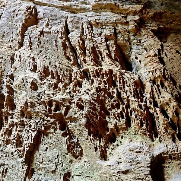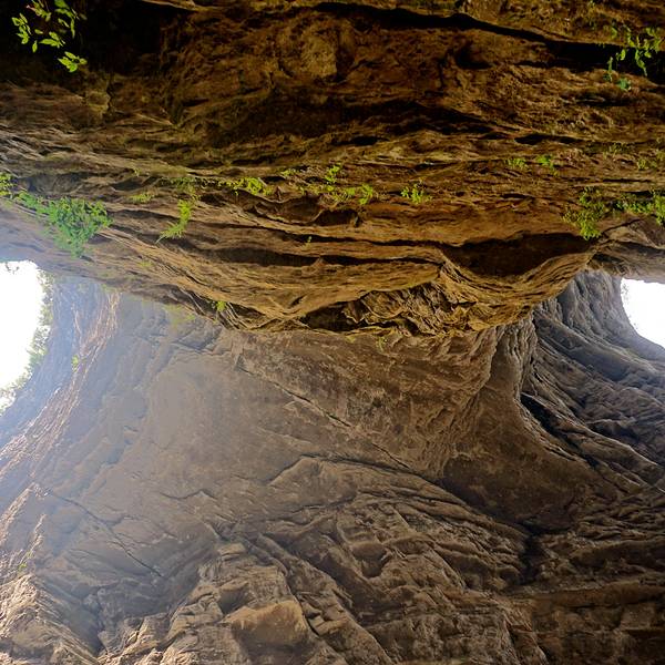 从桥下仰视,拱孔高旷,壁立千仞,洞顶逐次崩塌断面呈弧形平行分布。