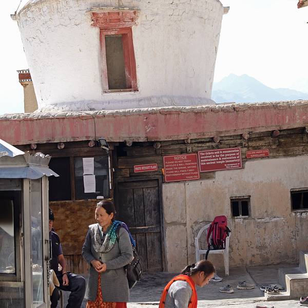 第一个地方是Shey Palace,马路的另一边是一片湿地水泽,还有野鸭野鹅,鱼群嬉戏,芦苇丛生,背景是远处的雪山,还以为贫瘠的拉达克地区除了印度河之外便一片干燥,没想到还有这么生机勃勃的地方。我们一边拨着转经筒一边走上坡,没有拾级而上进入Palace,大伙儿反而是跟着我的步伐来到西北的白塔处,从白塔背后可以绕道最高处,三个姑娘一直跟着我走,老怕自顾自走了另一条路,结果回到了Palace背后的山脚,再重新爬上来,我就得意了一番:“姑娘们以后记得跟着方向感男人(我自己)走!”