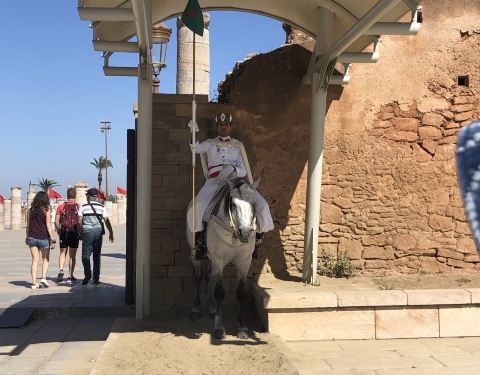 拉巴特古迹多,引人注明的古迹有哈桑塔,在哈桑塔入口处左右两旁各有一位头戴绿色的帽子,帽子的绿色中镶嵌着菱形的白色,身穿红衣白色披肩腰间佩戴白色腰带,脚穿皮靴双手带着白色的手套,左手牵着马缰绳,右手肘关节屈曲持着3米多长的标枪骑在剽悍的马背上皇家卫兵担任守卫