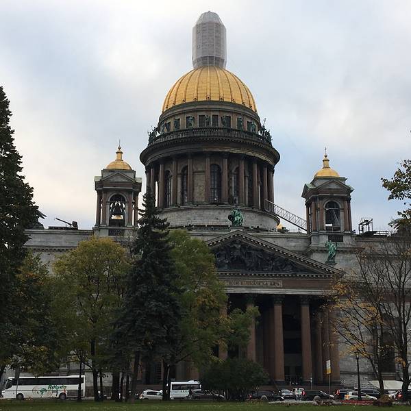 圣伊撒基耶夫大教堂,也叫圣伊萨基辅大教堂,始建于1707年,已有300年历史。由法国建筑师蒙弗朗主持设计,前后共有44万人参与建造,历时40年之久。其建筑体量伟岸,气势宏大,构思精巧。厅和殿皆以大理石装饰,且有以贵重的蓝、绿孔雀石材质建成的立柱,美不胜收。被认为是仅次于罗马梵蒂冈圣彼得大教堂、德国科隆大教堂的世界第三大教堂。伊萨基耶夫教堂,是圣彼得堡的象征。教堂高102米、长112米、宽100米,整个建筑可同时容纳1.2万人举行宗教仪式。