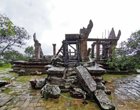 柏威夏寺是一座位于柬埔寨和泰国边境的古代高棉印度教寺庙,两国对此庙的归属有争议,目前该寺处于柬埔寨柏威夏省的实际管辖之下,2008年,该寺被认定为世界文化遗产。柏威夏寺的历史可追溯到公元9世纪,它是高棉帝国的君主下令建造的,建于公元10世纪中叶至12世纪初,矗立在550米高的峭壁上,可俯瞰整个柬埔寨平原。由于地处偏远,地形险要,柏威夏寺保存得相当完好;其建筑风格与吴哥窟相似,这个古代寺庙遗址分布在长800米,宽400米范围的峭壁上,四面有长长的阶梯上下;寺有四层,带四个庭院,每层都有山门和围墙,体现了吴哥王朝时期独特的建筑艺术风格。世界遗产委员会指出,柏威夏寺具有很好的地势,其建筑充分融入了自然景观与宗教功能,寺内精致的石雕更是古代文明的瑰宝。