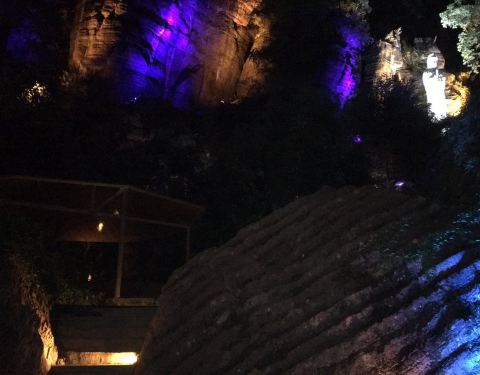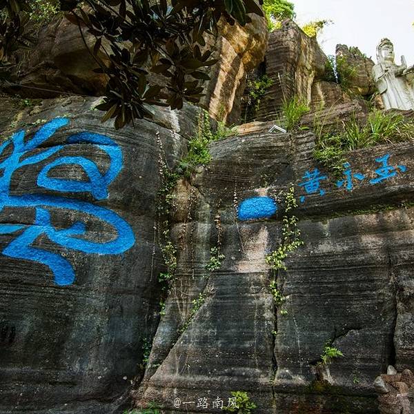 温泉旁的石块上有著名画家黄永玉的题字,沿着阶梯向上,但见半山耸立着一座观音像。无限惬意