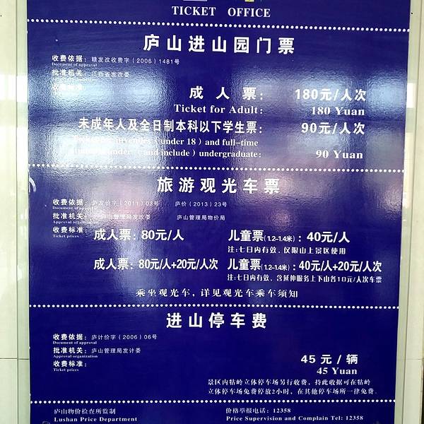 在上庐山牯岭镇之前,行驶12公里到达庐山北门服务中心,大巴师傅会停在上山口,让所有乘客下车买门票。这是门票价格,但九江市民可以凭身份证免门票上庐山。买了票坐扶梯在二楼停车场再次上车。提醒大家一下,在九江有很多出租车拉客去庐山,但打车150元只到售票处,不去庐山牯岭镇。就算有些出租司机说要到山上,也不要太确信。去庐山最好的方法就是自己坐班车上去,再购买观光车票,这样玩得也比较自在一些。