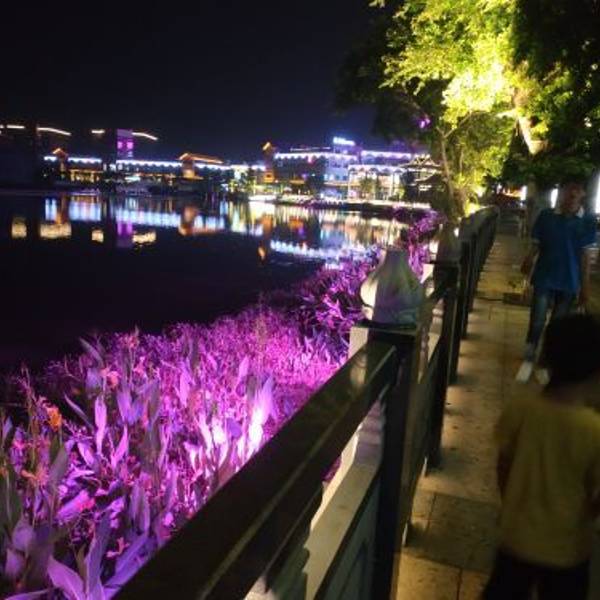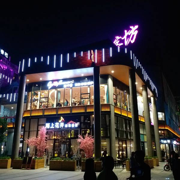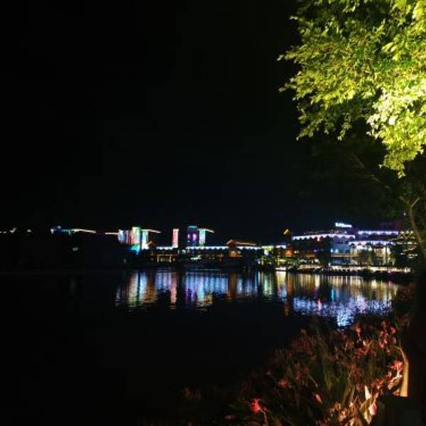 在去哪儿攻略上,我看得了很多人对于华阳湖夜景的描述,深深地吸引了我。于是就趁着夜色降临,我打的从大朗前往华阳湖,观看华阳湖的夜景。 果然深深震撼了我,夜色下的华阳湖,格外宁静。在色彩斑斓,璀璨艳丽的灯光下,更增加了一份神秘。灯光中,湖面上的喷泉打破了夜空的寂静,仿佛一个出色的舞者以湖面为舞台,翩翩起舞。然后向着喷泉缓缓驶来的一整排船只,就是给喷泉伴舞的人。让这出表演更加精彩。 在华阳湖的游船服务站,有提供游船服务的项目,带领观众进入到舞台中,观众也成为演员,参与了这出精彩的表演。 而舞台的周围的观众席,是华阳湖开发的商业地带:创客坊。然后就是中山大学新华学院的校区。这个观众席是一个功能强大的观众席,为舞台提供灯光,为舞台提供荧幕:新华学院的宿舍楼也装上了灯光,播出了一幕幕蝴蝶飞起的画面。 而且创客坊这个强大的观众席,提供各种满足游客的服务。这里有手信商店,可以购买粤式的糕点、小吃;这里有酒吧,三五好友可以约在一起,开怀畅饮;这里有酒店,但夜深人静的时候,随时有个地方让人休息。 这里是华阳湖,这里有东莞最精彩的夜景。