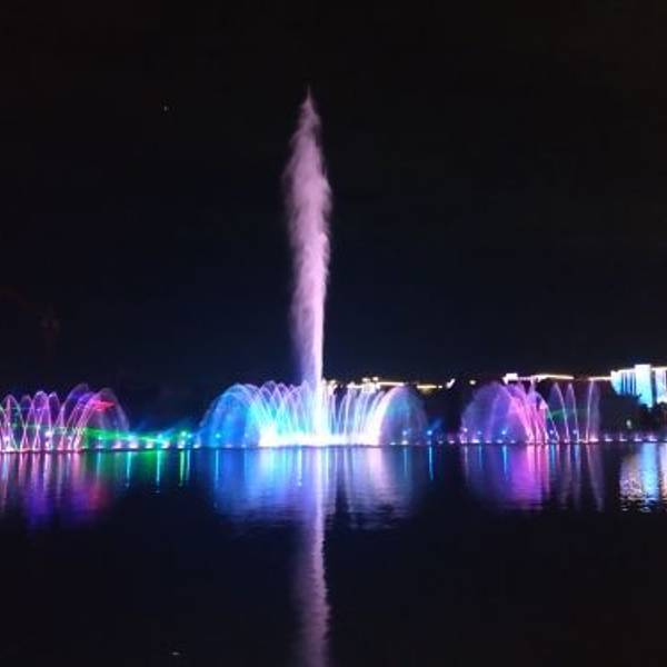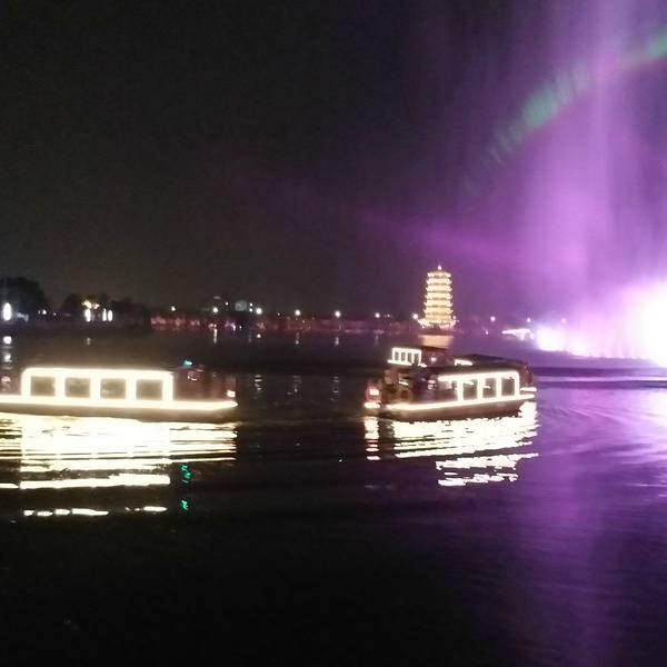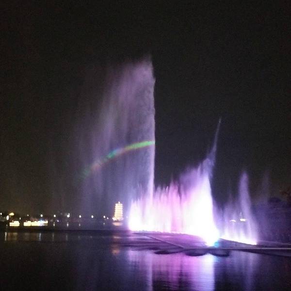 果然深深震撼了我,夜色下的华阳湖,格外宁静。在色彩斑斓,璀璨艳丽的灯光下,更增加了一份神秘。灯光中,湖面上的喷泉打破了夜空的寂静,仿佛一个出色的舞者以湖面为舞台,翩翩起舞。然后向着喷泉缓缓驶来的一整排船只,就是给喷泉伴舞的人。让这出表演更加精彩。