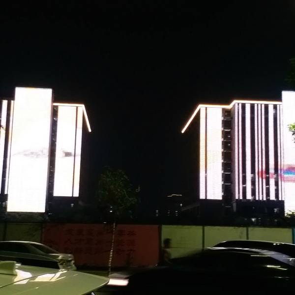 而舞台的周围的观众席,是华阳湖开发的商业地带:创客坊。然后就是中山大学新华学院的校区。这个观众席是一个功能强大的观众席,为舞台提供灯光,为舞台提供荧幕:新华学院的宿舍楼也装上了灯光,播出了一幕幕蝴蝶飞起的画面。