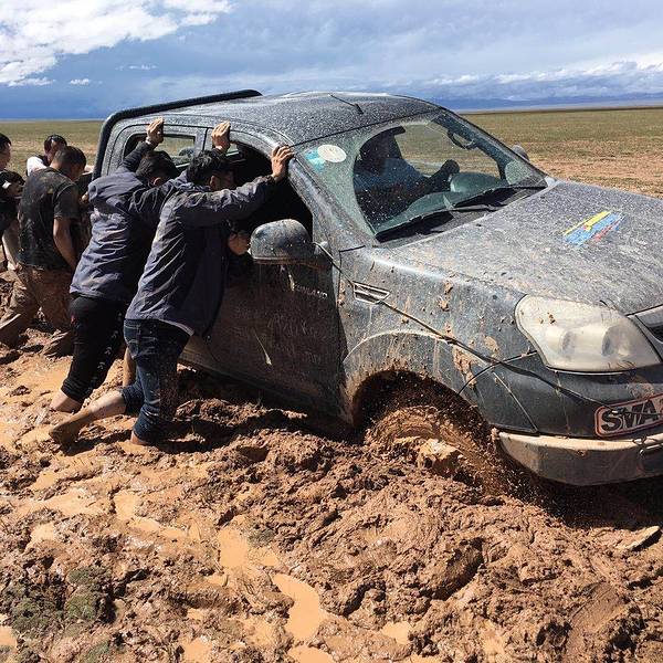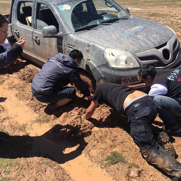 结果一路都是非常泥泞的土路,我们的车极容易被陷。