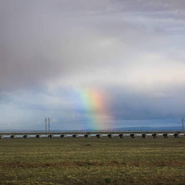 雨季的 可可西里 ,一边下着雨,一边是太阳。一道彩虹出现在铁轨之上。黄昏时分的青藏公路,黄昏十分美