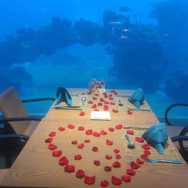 也许是记忆习惯,早在2012年我第一次来三亚的时候,我就住在海棠湾。 2015年那次又是,所以这次,在计划行程的时候,我就强烈建议小伙伴来海棠湾住。 小伙伴一开始觉得海棠湾远,过来实际操作以后,还是觉得决定是正确的。 在三亚的最后时光,我们就认认真真泡酒店。 有些地方,去玩之后,才发现是网红餐厅呀! 比如海棠湾天房洲际的海底餐厅。 位置:三亚海棠湾天房洲际酒店内 价格:午市自助588,晚市888(网上团购价) 营业时间:周一至周日 11:00—21:00毕竟吃的东西是一样的,所以我们选择午市。 觉得性价比高一些。中午的时候阳光比较强烈。 所以在餐厅的桌布上看到彩虹的机率很高。(不过我这张照片拍得不明显,肉眼看比较明显)这么浪漫的餐厅,必须要吃饭之前先拍够呀。 而且还要来一个装逼照才行。