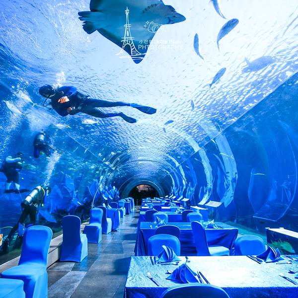 餐厅是国内很有特色的海洋餐厅,用餐时可以看到成群的鱼儿在头顶游过,还有水中美人鱼表演活跃用餐氛围。除…