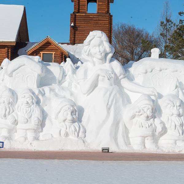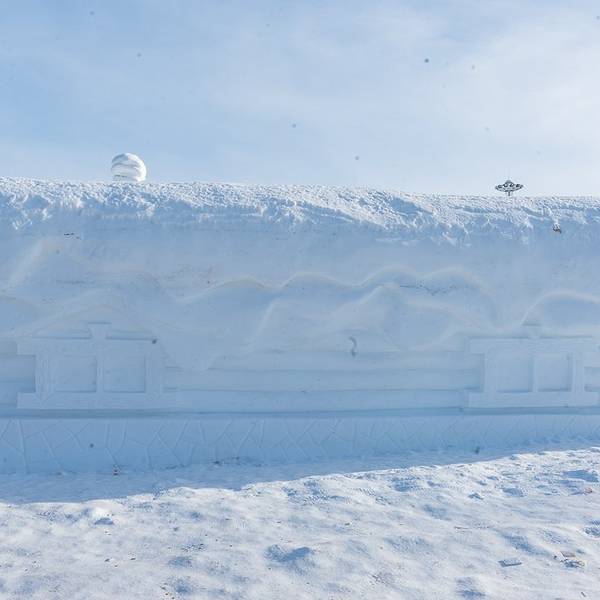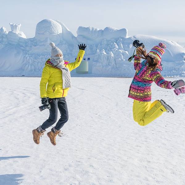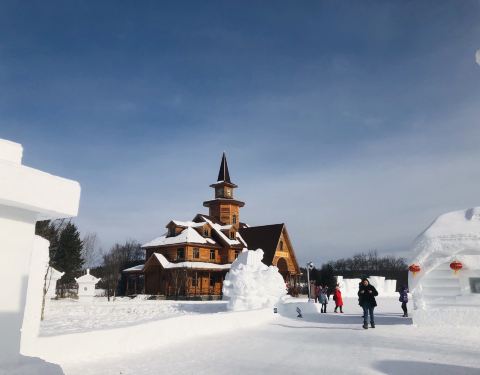 广场上有雪雕,还有冰雪小屋。冰雪小屋可以坐在用冰做成的椅子上拍照,但是一定得快,因为超级冷的说。
