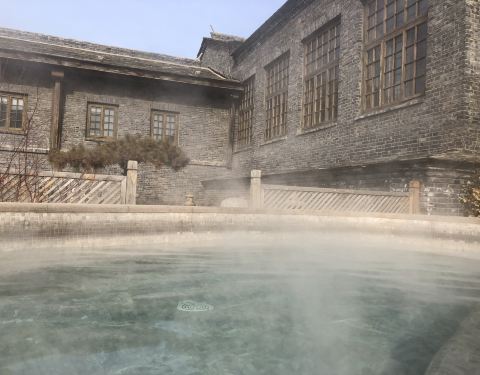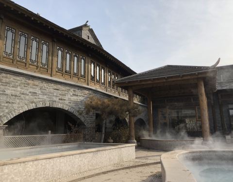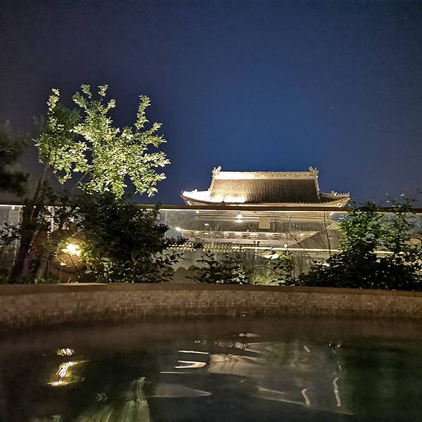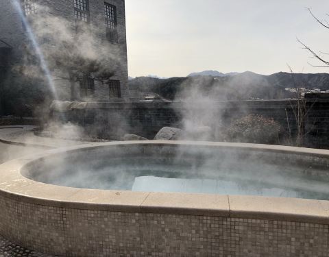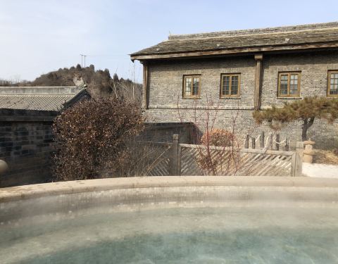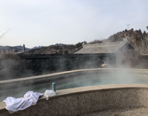 这次去了城上温泉馆,男女分浴,男士这边有大约8个不同的温泉池,有3个池子是户外的,还有汗蒸等桑拿。 一边泡温泉,一边看长城夜景,喝着冰啤酒,美不胜收! 按照北方上澡堂习惯,就差个搓澡了。哈哈哈。左手边是长城右手边是古寺