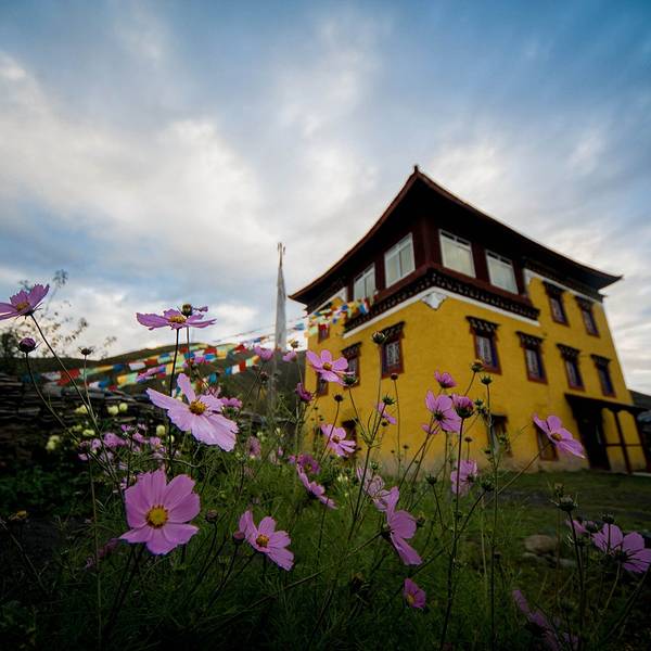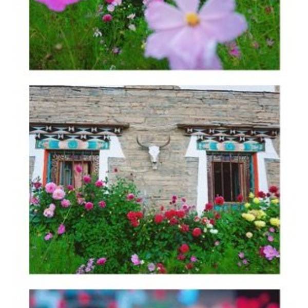 客栈建筑外观颜色鲜艳,映衬着格桑花,份外美丽。 展开